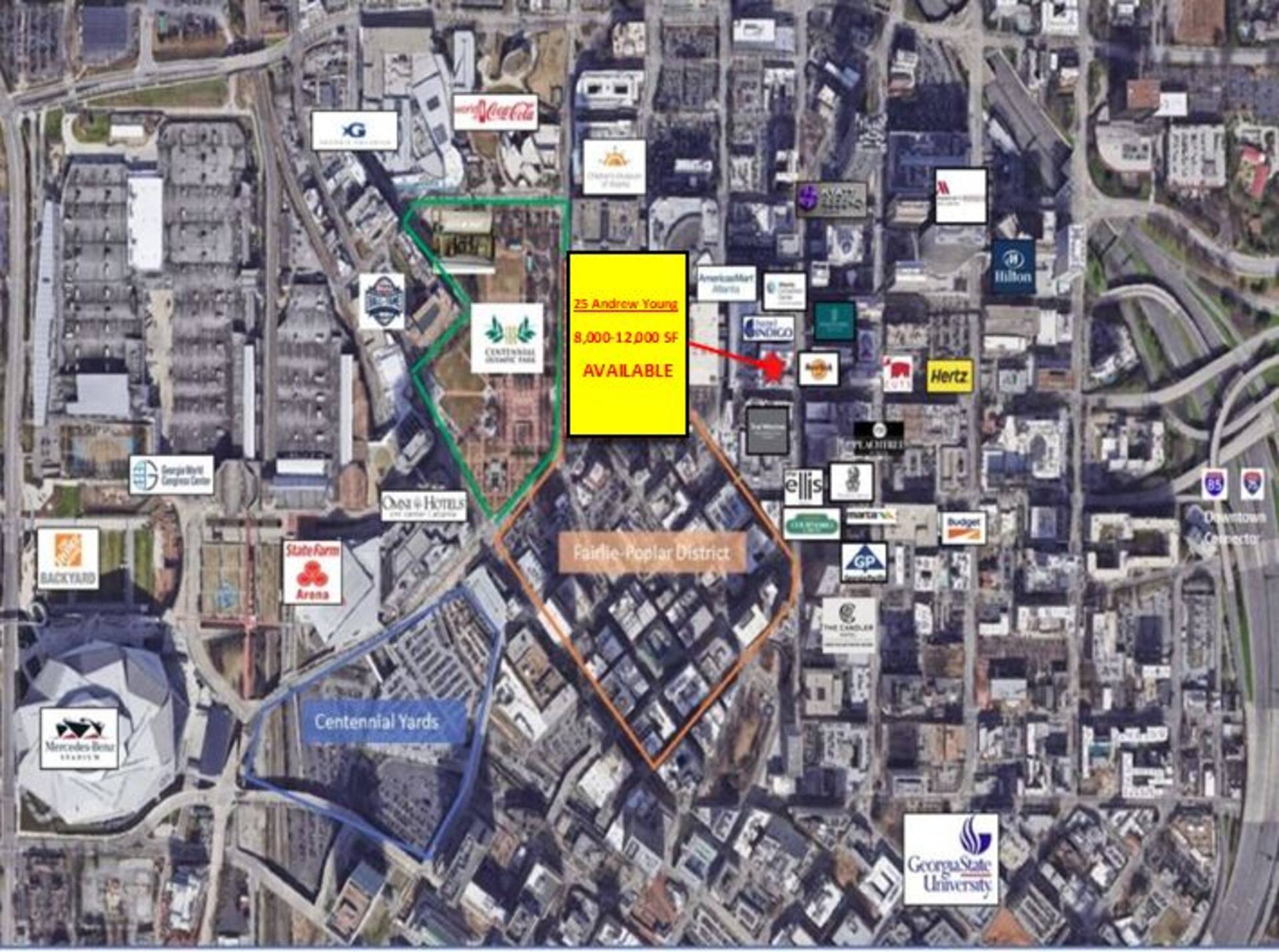 Atlanta, GA 30303- 25 Andrew Young a 350 space parking garage with 33,974 sf of street-level retail, is located in the heart of downtown in Atlanta's central business district (CBD), the largest of the city's three commercial districts. This prime downtown location with prominent frontage on both Peachtree Street and Andrew Young International Blvd has approximately 11,905 SF of restaurant/retail space available for lease.
